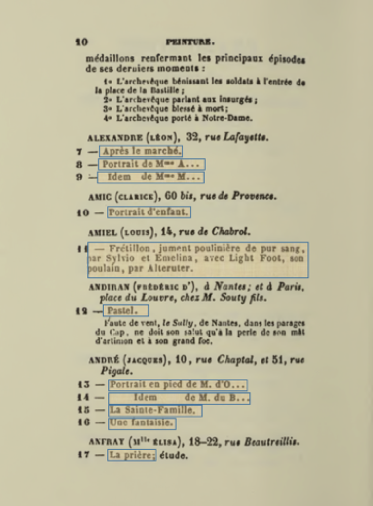 Figure 1: Extract from the catalogue for the Salon of 1824 with the main part of each entry highlighted