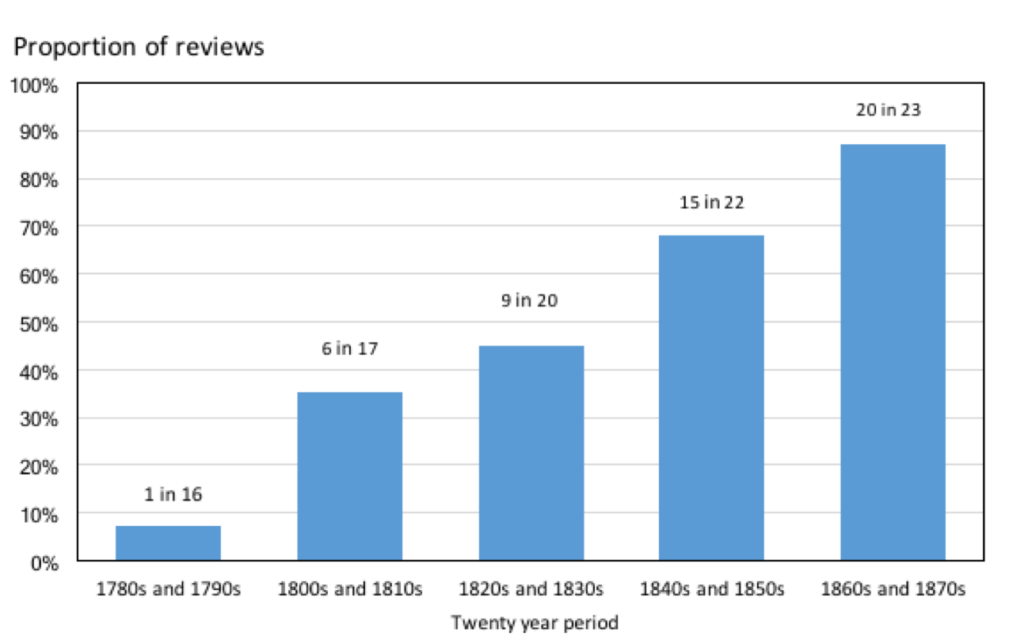 To complement my analysis of catalogue entries, I also assembled a sample of critical writing on the Salon in electronic format, to allow for key word searching and other analyses. Salon criticism was a recognised literary genre in the French art world and critical reputations were often made through Salon reviews. At any one time there could be up to several hundred critics reviewing the Salon. However, the number of reviews available in electronic format through resources such as the Bibliothéque Nationale de France’s electronic library and Google Books is much more limited, and my sample extended to 98 reviews in total. Of these 98 documents, 80 were published in book format, mainly contemporary publications but also some compilations of earlier Salon reviews, and 18 were articles from newspapers and journals. Although this is only a very small proportion of all the Salon reviews produced, it extends across my period of interest, includes critics of all persuasions and was sufficient for my purposes of understanding the emergence of titling. As will be seen, the trends within this limited sample are so pronounced that they can be regarded as giving a strong indication of change in the French art world. It was not my aim to perform an independent analysis of critical writing, for which a much larger sample would have been required.
