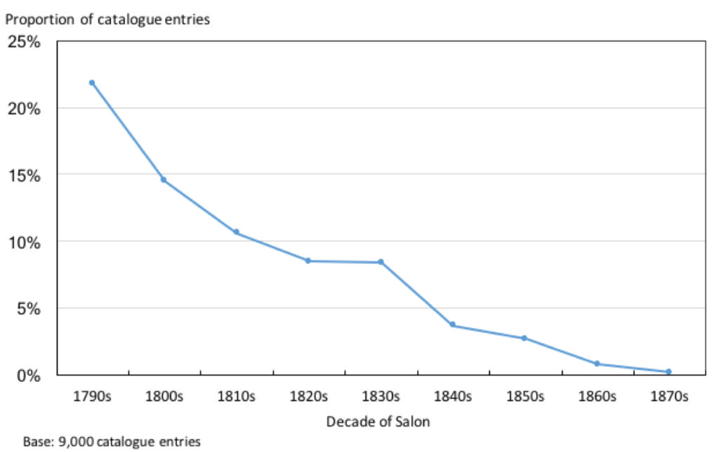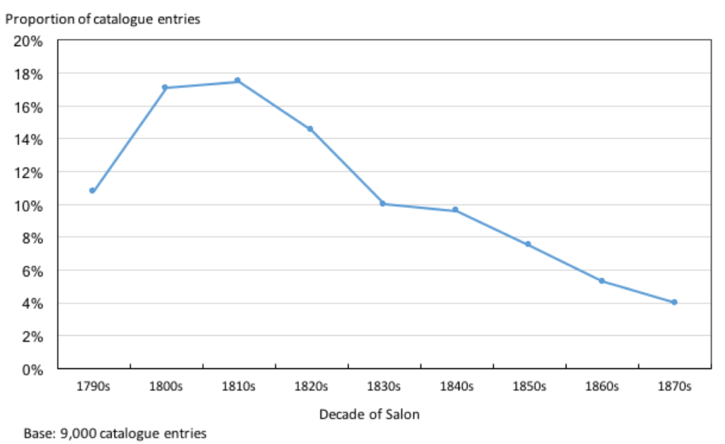I started my database from the 1790s, taking my lead from Yeazell, but also as this was the first decade in which the Salon was opened up to all artists following the 1789 Revolution. In my first pass through the data I ended in the 1870s, as the last decade in which the Salon remained the dominant institution for showing new art. In the end I did not have to deviate from this choice and so my database ran from the 1790s to the 1870s, and included 9,000 entries.