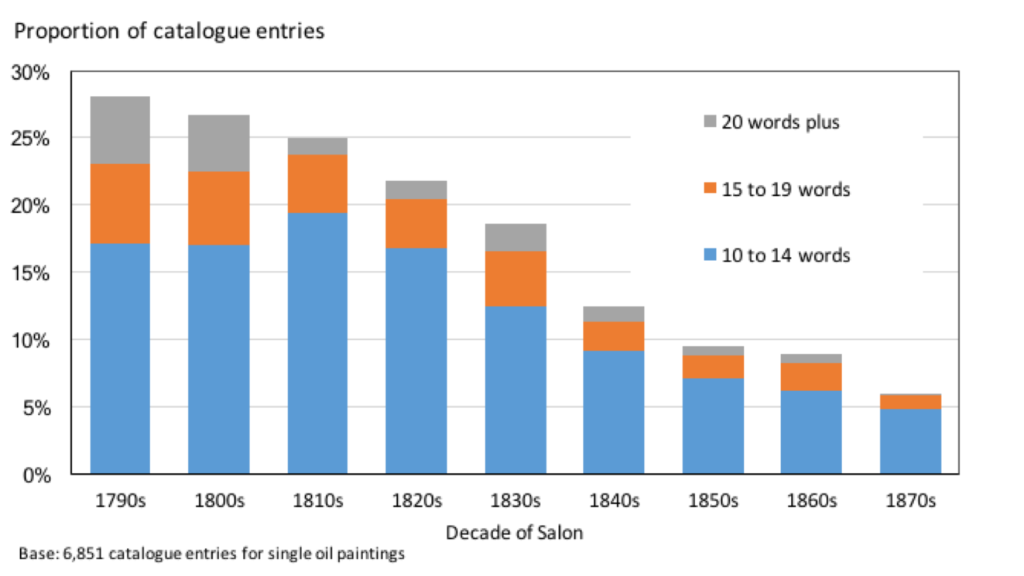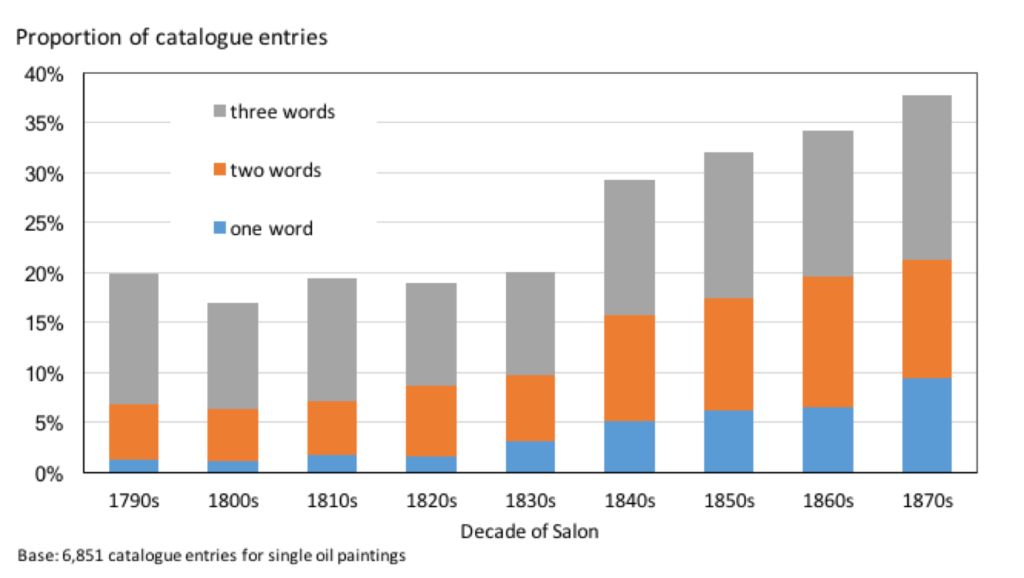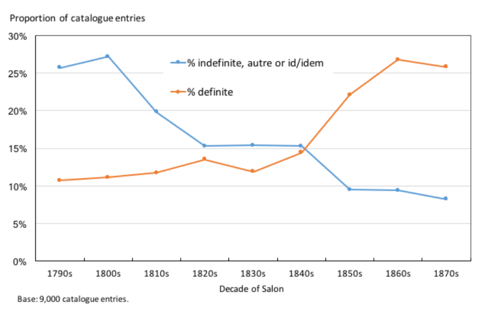 Through the quantitative, systematic and sample-based approach that I have taken, it becomes possible to confirm the 1790s as the decade in which titling most likely began to emerge in France, to map out that process of practical and conceptual change, and to identify the 1870s as the decade by which it was largely complete. What this amounts to is a re-understanding of those entries and the way in which they were used, and a corrective to standard art historical thinking. Art historians typically write about the nineteenth century French art world as if paintings always had titles, and about catalogue entries as if they were always used and understood as such.