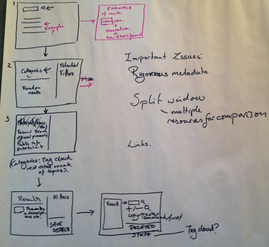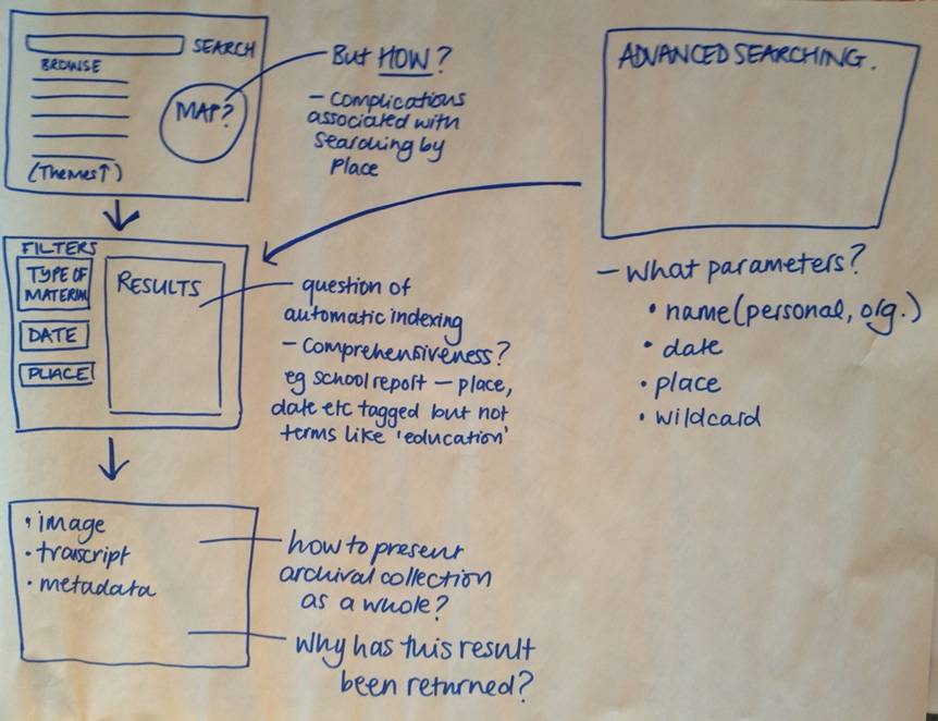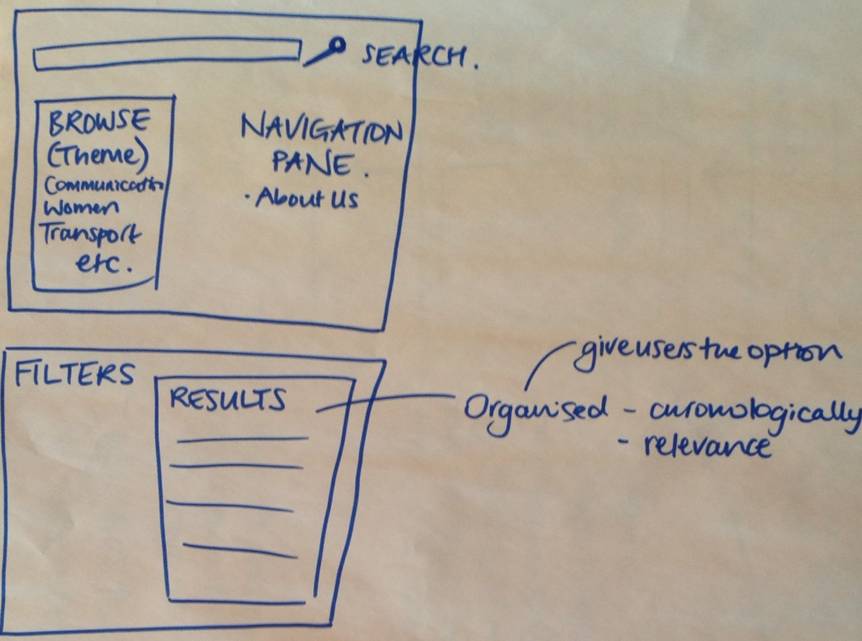 The participants did not have a fixed idea of a topic or theme and found this task quite challenging. Although it perhaps is not fully reflected in the design they committed to paper, they discussed in depth how a ‘browse’ function might be structured in terms of themes etc. and thought about the option of a separate navigation pane and ‘about the project’ section all as part of a home page setup. They also considered how results might be filtered and search results organised (i.e. chronologically or by relevance) and made clear that the user should be given the option to configure this to suit their own needs.