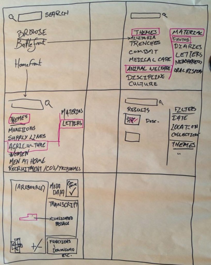 This group took the theme of animal welfare and concentrated on how the browse function might work in terms of creating access points for the non-expert user. They came up with a split into battlefront and homefront followed by differing lists of themes for each and the ability to refine by resource material or ‘type’. They also discussed possible filtering parameters and looked at how search results might appear i.e. with thumbnails and a description, as well as what functionality would be provided when viewing a search result which they carried through and developed for the second aspect of ‘visualisation’.