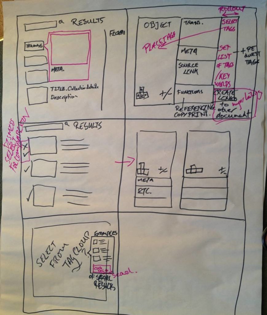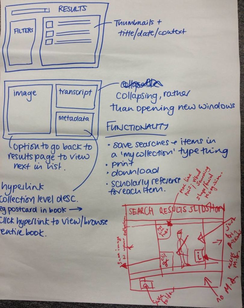 The group discussed how to present search result lists in terms of thumbnails, contextual information and the option to further refine their search through filters. They produced a version of how the screen might be usefully split and how each section could work, accompanied by a list of possible functionality. They also had a “wacky” idea for visualising search results by way of a slideshow.