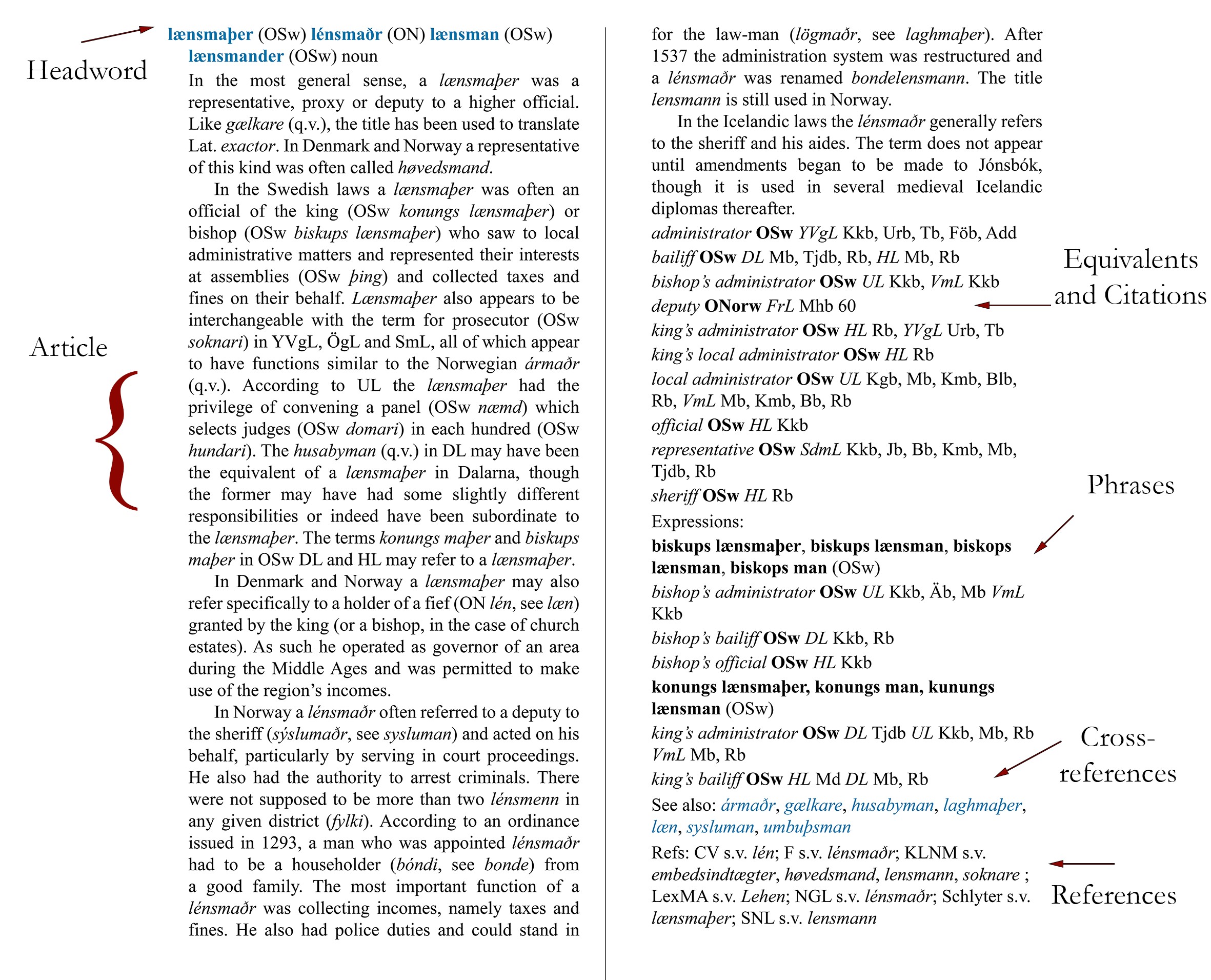 Each entry contains English equivalents and textual references as found in most dictionaries treating historical languages. The headword line lists forms of the excerpted term, including some of the most common spelling variants. Entries in the lexicon are lemmatized and organized according to the Old Swedish form of the headword, if there is one, as the Old Swedish laws form the bulk of the source material within the LMNL. Otherwise the terms are alphabetized according to the Nordic language abbreviation.